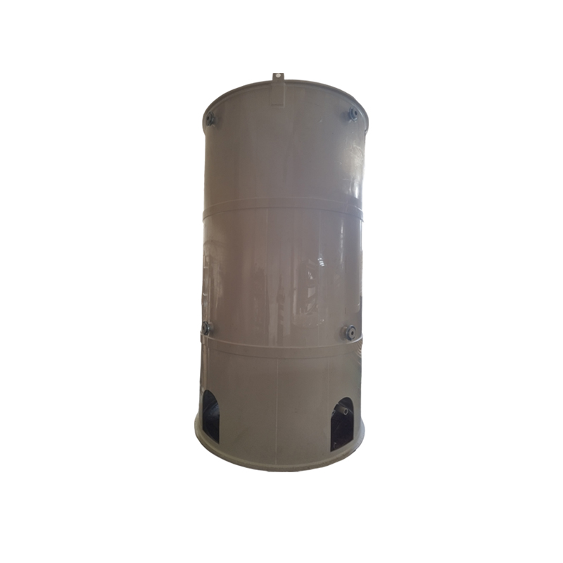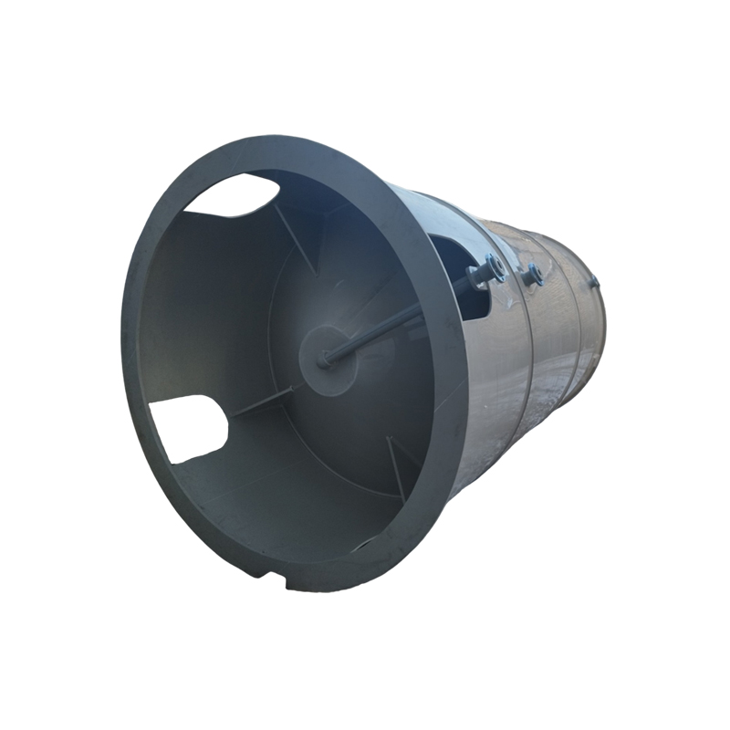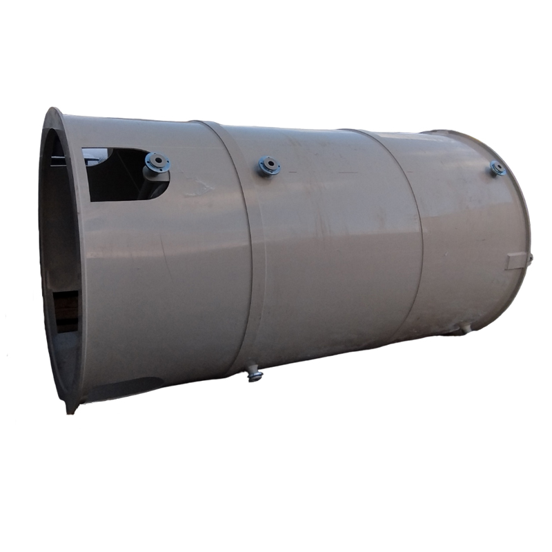 Бункер с коническим дном (полный слив) и монолитными пластиковыми ногами, с толщиной стенки и конуса 10 мм, толщина верхней крышки 20 мм, с верхней резьбовой крышкой Ф 620 мм с дыхательным клапаном, с нижним фланцевый отводом под 90 градусов ДУ 50 и боковыми фланцевыми отводами ДУ 50, с верхними проушинами и четырьмя нижними вырезами для обслуживания нижнего отвода из бункера.