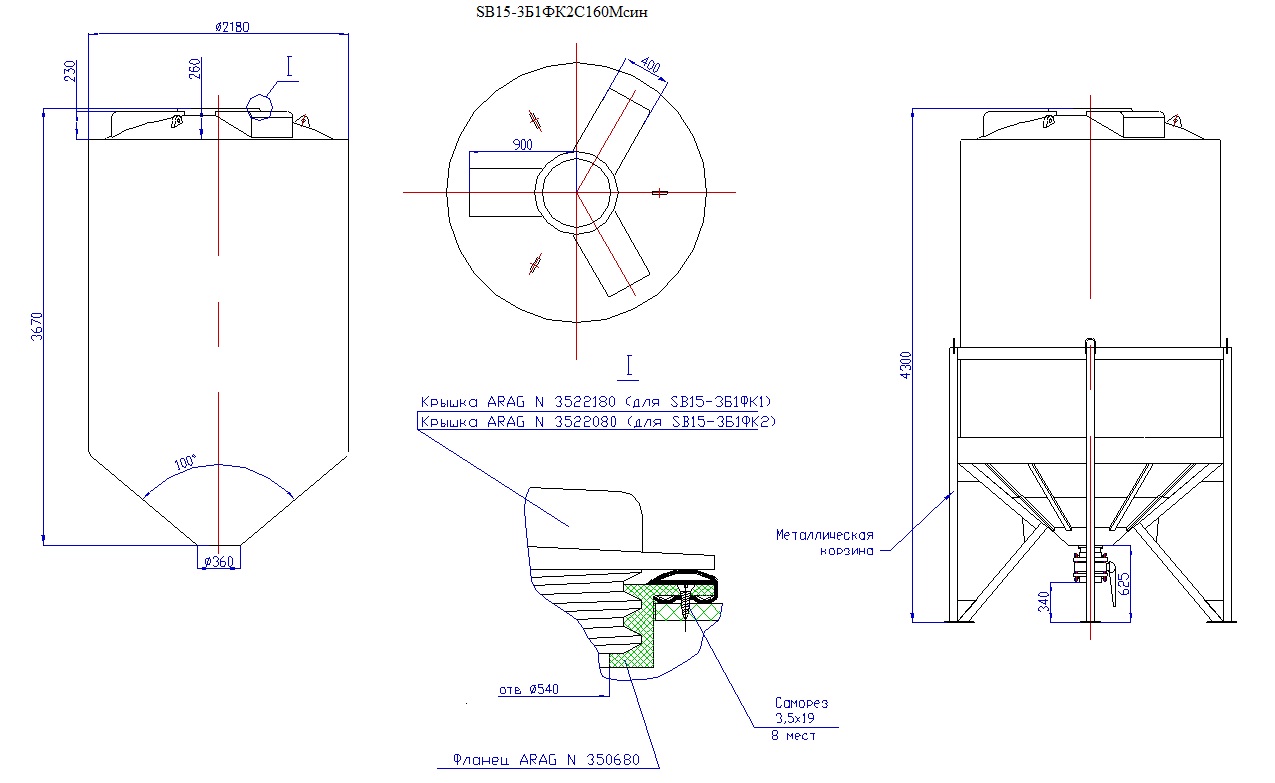 - Конструктив: полипропилен, конусное дно 60°, опорная рама