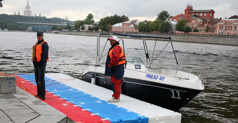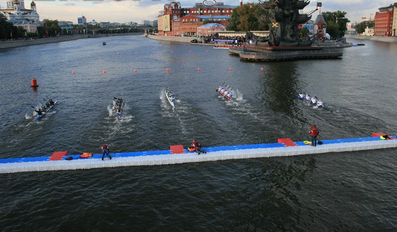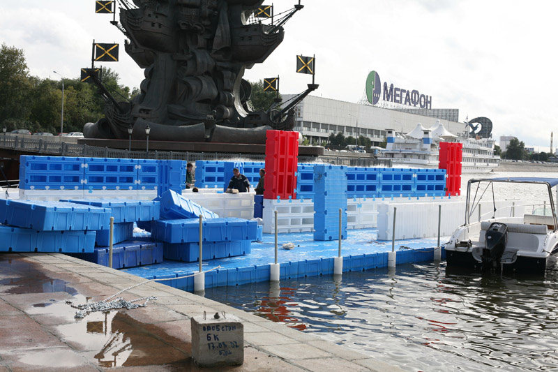 Плавучая понтонная площадка на Москве-реке для проведения городских мероприятий: концертная сцена, стартовая платформа для регаты, причал для катеров. Модульная конструкция из блоков 2000 × 1000 × 400 мм с красным ковровым покрытием и ограждениями.