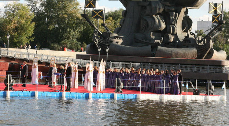 Организовать плавучую площадку на Москве-реке для проведения праздничных мероприятий ко Дню города: концертная сцена для хора и оркестра, стартовая платформа для гребной регаты, причал для подхода катеров с гостями.