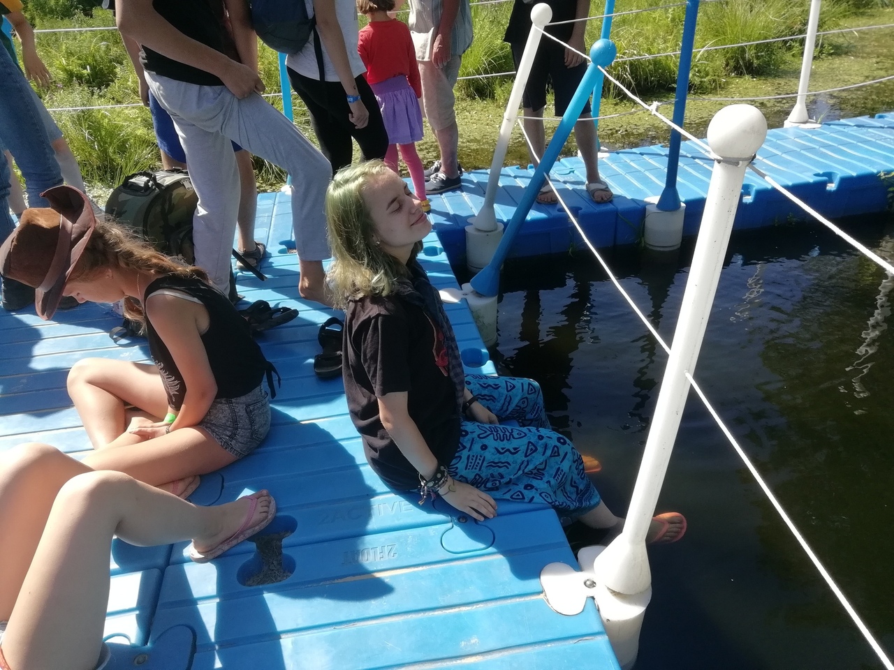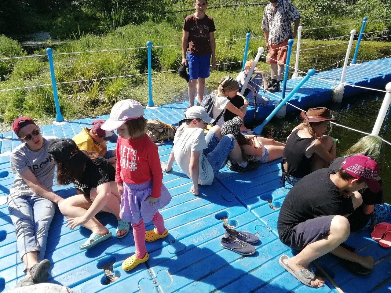 Организовать безопасную зону купания и отдыха на лесном озере с пологим заиленным берегом, где отсутствует удобный подход к воде. Требовалась плавучая платформа для размещения 15—20 человек одновременно, с ограждениями и переходным мостком к берегу.