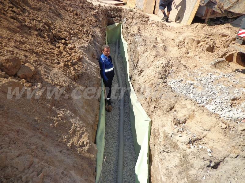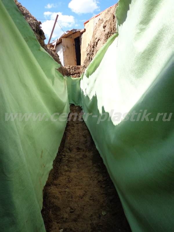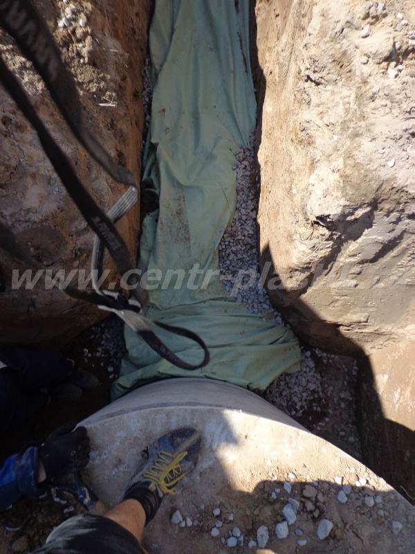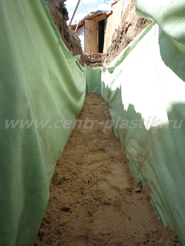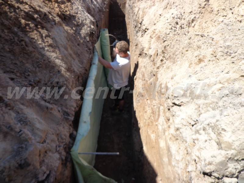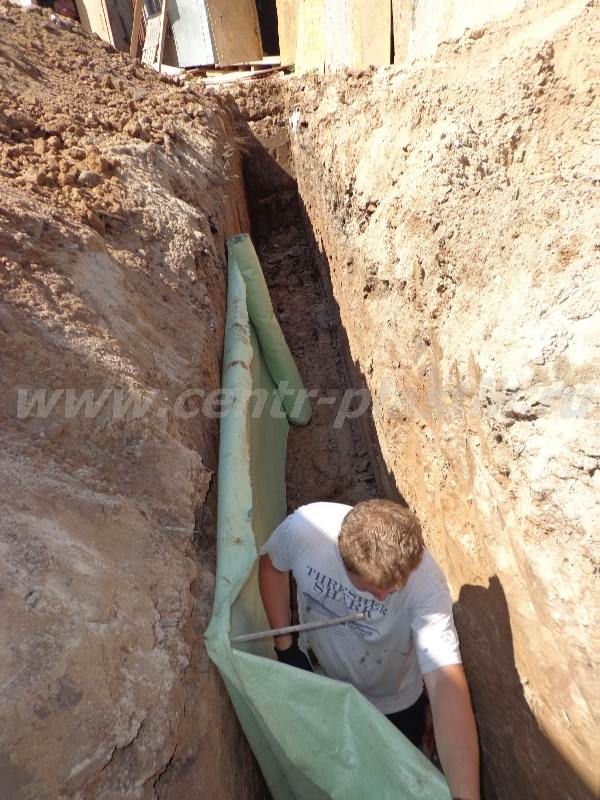 - Укладка перфорированной дренажной трубы с геотекстилем