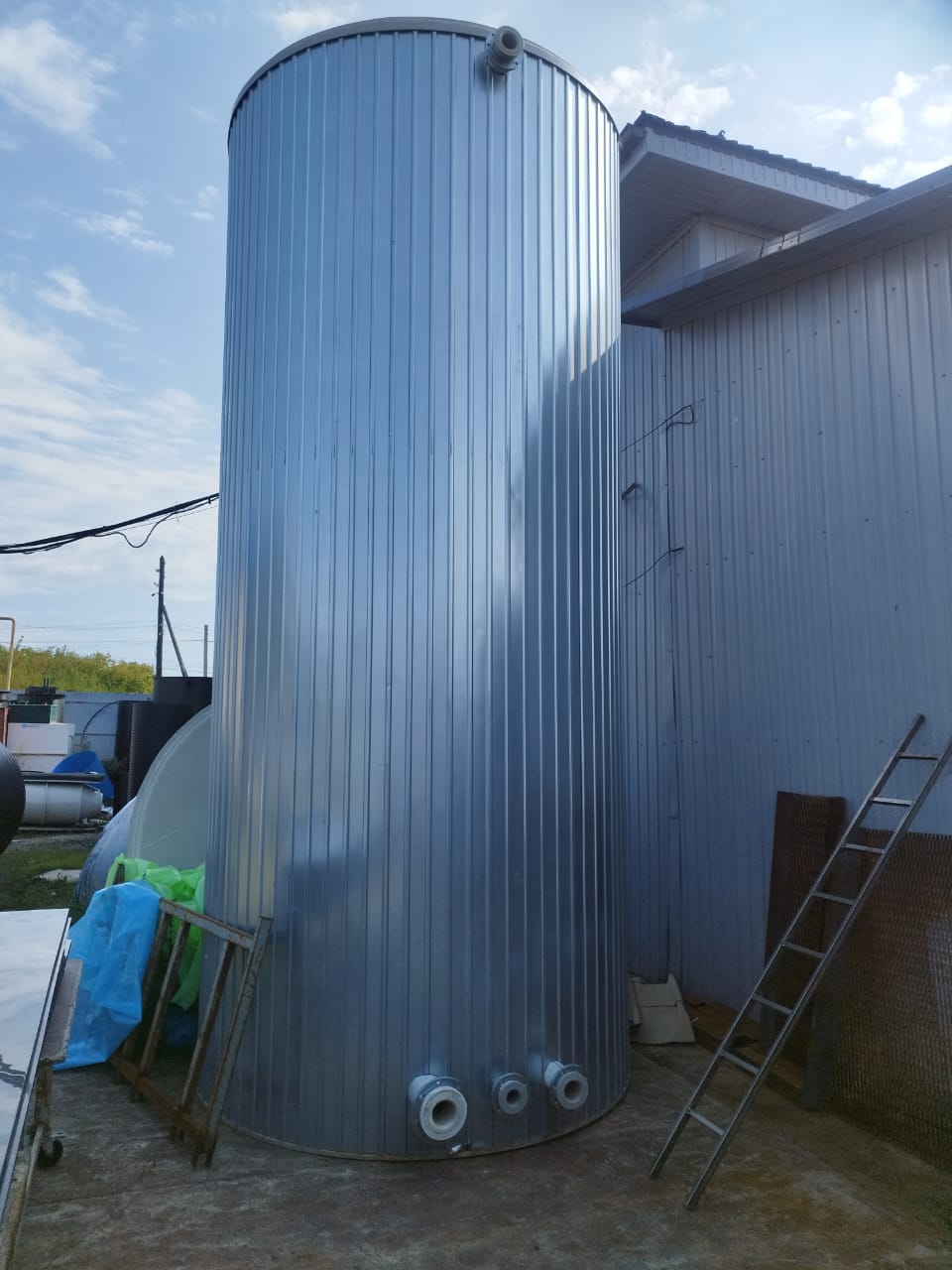 Уличная ёмкость ГВС должна выдерживать горячую воду до 95 °C и не замерзать зимой. PP-H 25 м³ (Ø2400 × H5600 мм) с утеплением стизолом 30 мм и облицовкой С10.