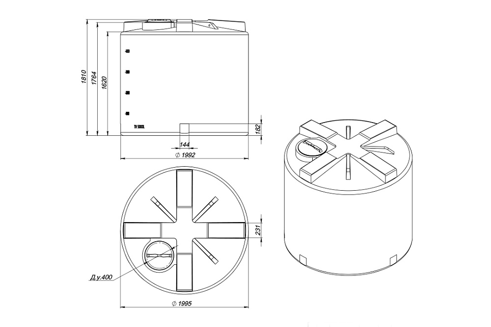 Емкость ТН 5000 изготовлена методом ротационного формования, что гарантирует ее герметичность, прочность и надежность. Бак оснащен крышкой с дыхательным клапаном. В бочку можно установить любые отводы и краны и всю необходимую арматуру, в зависимости от предназначения емкости. -