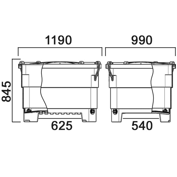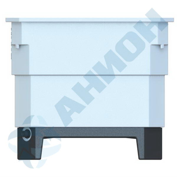 Контейнер имеет прямоугольную форму с объемом 640 л. Корпус выполнен с ребрами жесткости для повышения прочности. В нижней части корпуса интегрирован пластиковый поддон для удобства перемещения с помощью вилочных погрузчиков. В днище предусмотрено отверстие для слива.