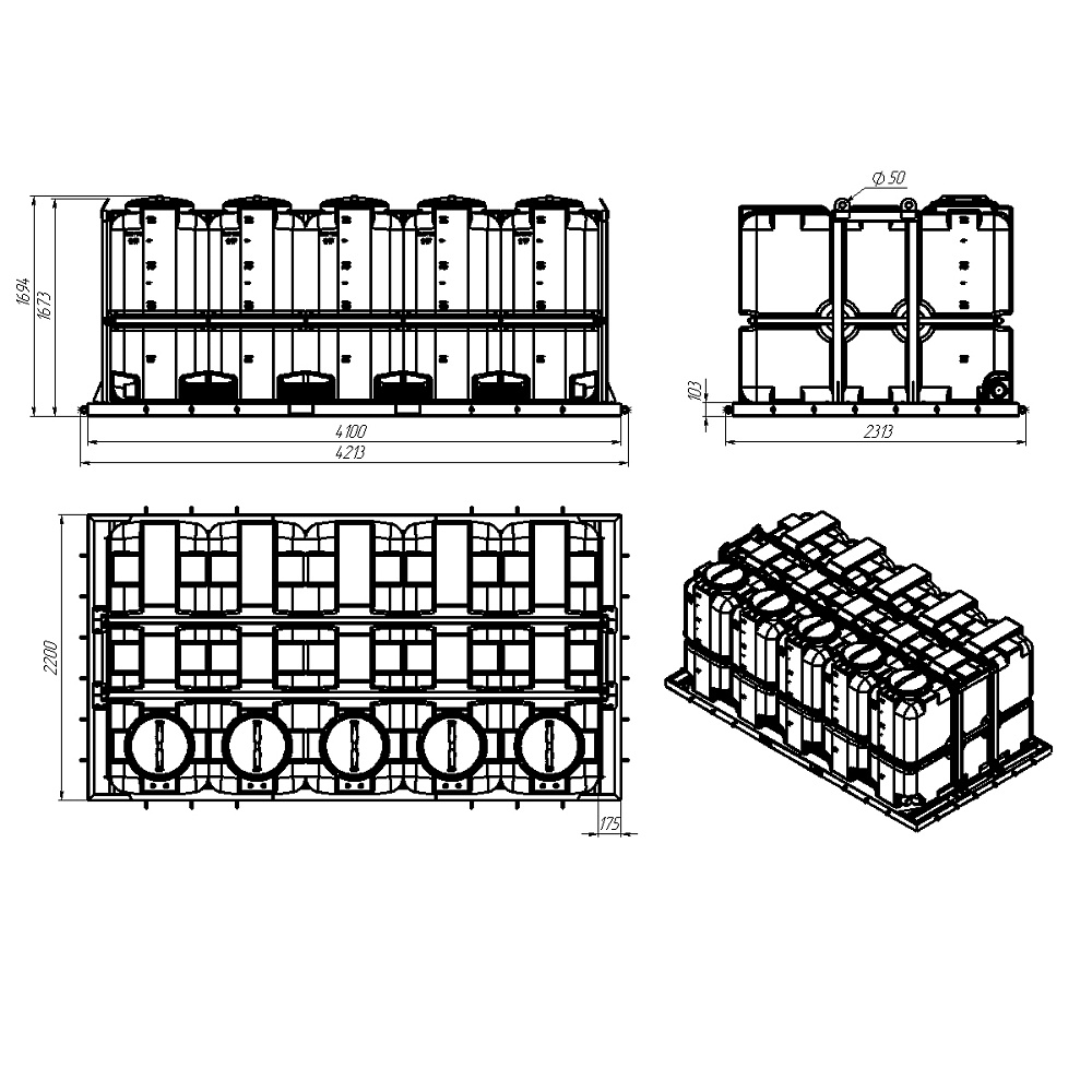 На верхней части топливной емкости расположена заливная горловина ø356 мм с внутренней резьбой, комплектуемая резьбовой крышкой, а также 4 резьбовых отверстий (2 отверстия ø1 дюйм, 2 отверстие ø2 дюйма) комплектуемых пластиковыми заглушками для соединения емкостей в систему, а также монтажа фикс-пакетов.
