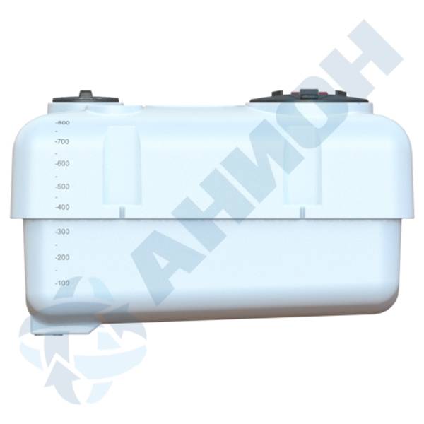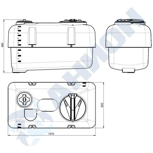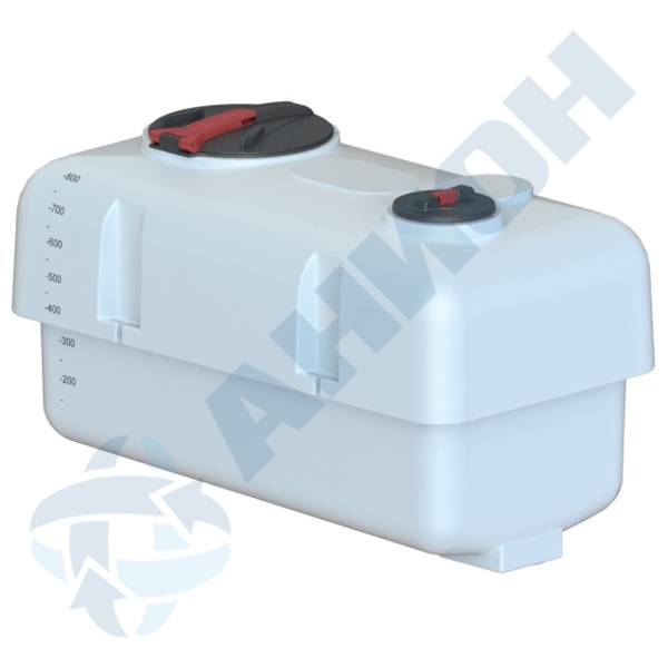Емкость имеет прямоугольную форму с зауженной нижней частью и дно с уклоном для обеспечения полноты слива. На боковой поверхности нанесена шкала определения уровня жидкости. Сверху емкость оборудована заливной горловиной с откидной крышкой D380мм с поплавковым дыхательным клапаном и дополнительной крышкой D190мм. Под крышку D380мм возможна установка фильтра заливной горловины
