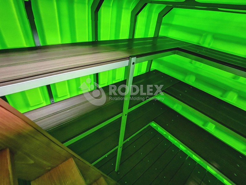 Внутреннее оснащение серии Modern: стальной каркас из трубы с порошковой окраской, полки и напольное покрытие из древесно-полимерного композита (ДПК) — не требуют покраски и обслуживания. Ширина полок до 450 мм. Деревянная лестница для удобного спуска. Люк размером 1200×700 мм обеспечивает свободный доступ внутрь.