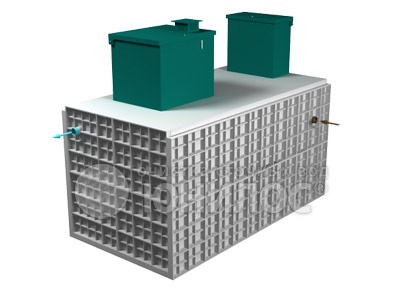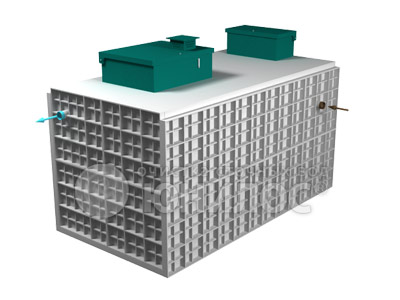 Корпус станции прямоугольной формы, выполнен методом экструзионной сварки. Габаритные размеры соответствуют объему 75 м³. Конструкция включает в себя входные и выходные патрубки для подключения к канализационной системе. На верхней плоскости расположены две крышки для доступа к внутренним камерам и обслуживания. По периметру корпуса предусмотрены ребра жесткости, обеспечивающие прочность и устойчивость конструкции.