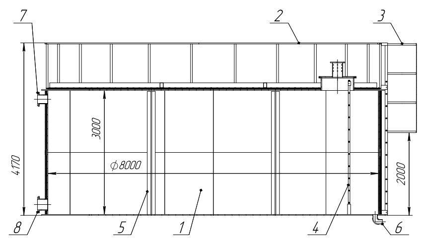 Конструкция емкости включает в себя цилиндрический корпус с плоским дном и крышкой. Габаритные размеры: диаметр 8000 мм (диаметр юбки основания 8400 мм), высота 3000 мм. Толщина стенки первого и второго поясов составляет 20 мм, толщина верха, низа и косынок – 25/20/20 мм. Цвет емкости – черный. В комплектацию входят: верхняя фланцевая крышка Ø800 мм, фланцевые отводы ДУ 100 (2 шт. для входа/выхода продукта), внутренние усиливающие стойки и косынки, утепление фольгированным стизолом (2 слоя по 20 мм) и облицовка оцинкованным профнастилом С-10 для защиты от внешних воздействий. Предусмотрены наружная металлическая лестница с защитным кожухом, внутренняя лестница из нержавеющей стали, верхняя крестообразная металлическая опора из профиля 120х80 мм и металлический верхний забор.
