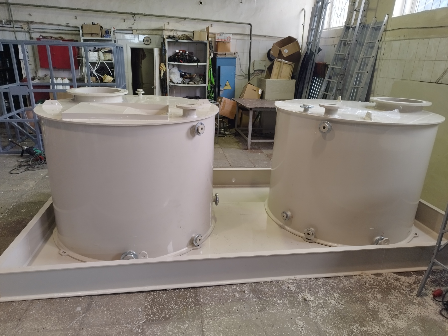 Две полипропиленовые емкости по 2,7 м³ на пластиковом поддоне для агрессивных сред