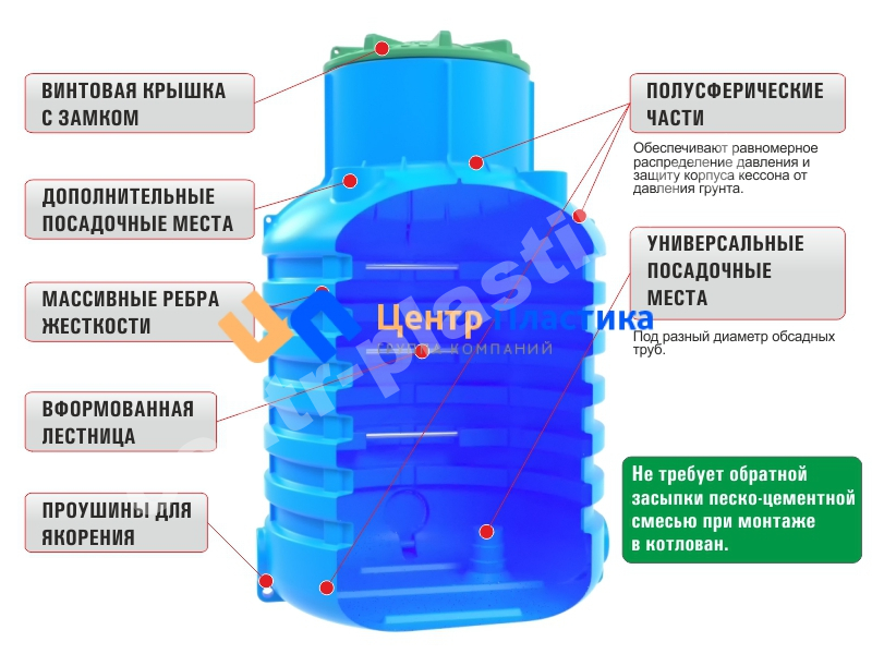 Завидная изначальная прочность кессона происходит от сочетания массивных ребер жесткости, герметичности емкости и скругленной конфигурации ее отдельных поверхностей. Что позволяет монтировать вне зависимости от разновидности грунта.